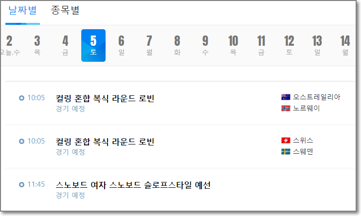 아래에 곧바로 대한민국 선수들의 경기 일정이 나옵니다.