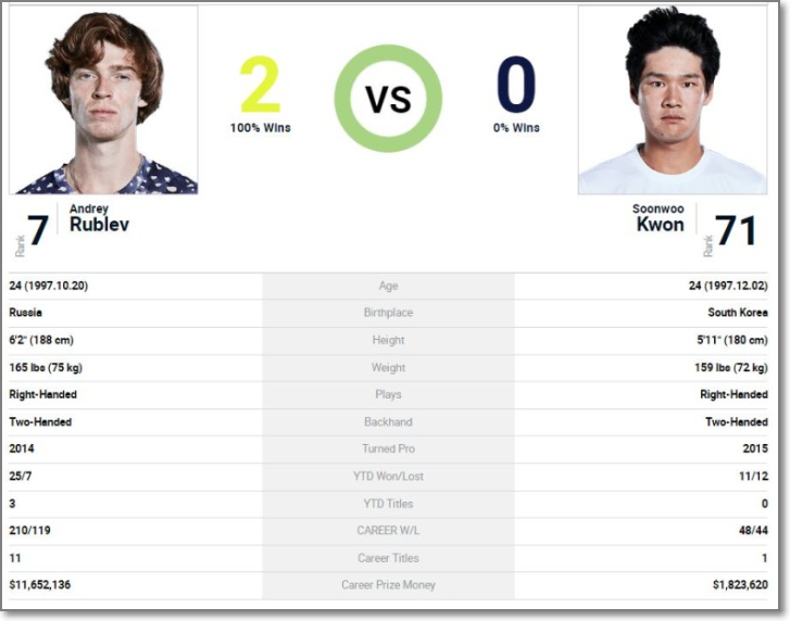 권순우(71위)의 1회전 상대는 7번 시드 안드레이 루블레프 선수입니다. 올해 로테르담 16강, 두바이 16강에서 대결해 권순우가 모두 패했습니다. 권순우는 지난해 3라운드(32강)에 진출해 메이저 최고 성적을 기록했었는데 올해는1회전에서 너무 강적을 만났습니다. 대진운이 좋지 않지만 최선을 다하는 길 외에는 없습니다. 권순우의 TOP 10 상대 전적은 0승 6패를 기록하고 있습니다.