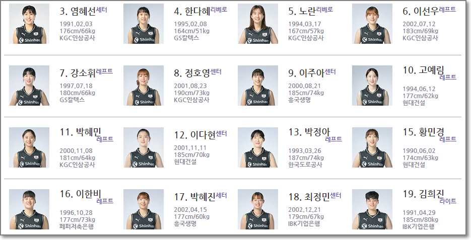 - 이주아(22, 흥국생명), 이다현(21, 현대건설), 최정민(20, IBK기업은행), 정호영(21, KGC 인삼공사)