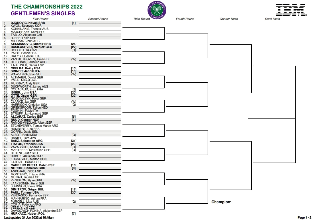 아래는 이번 윔블던 테니스 대회 대진표입니다.