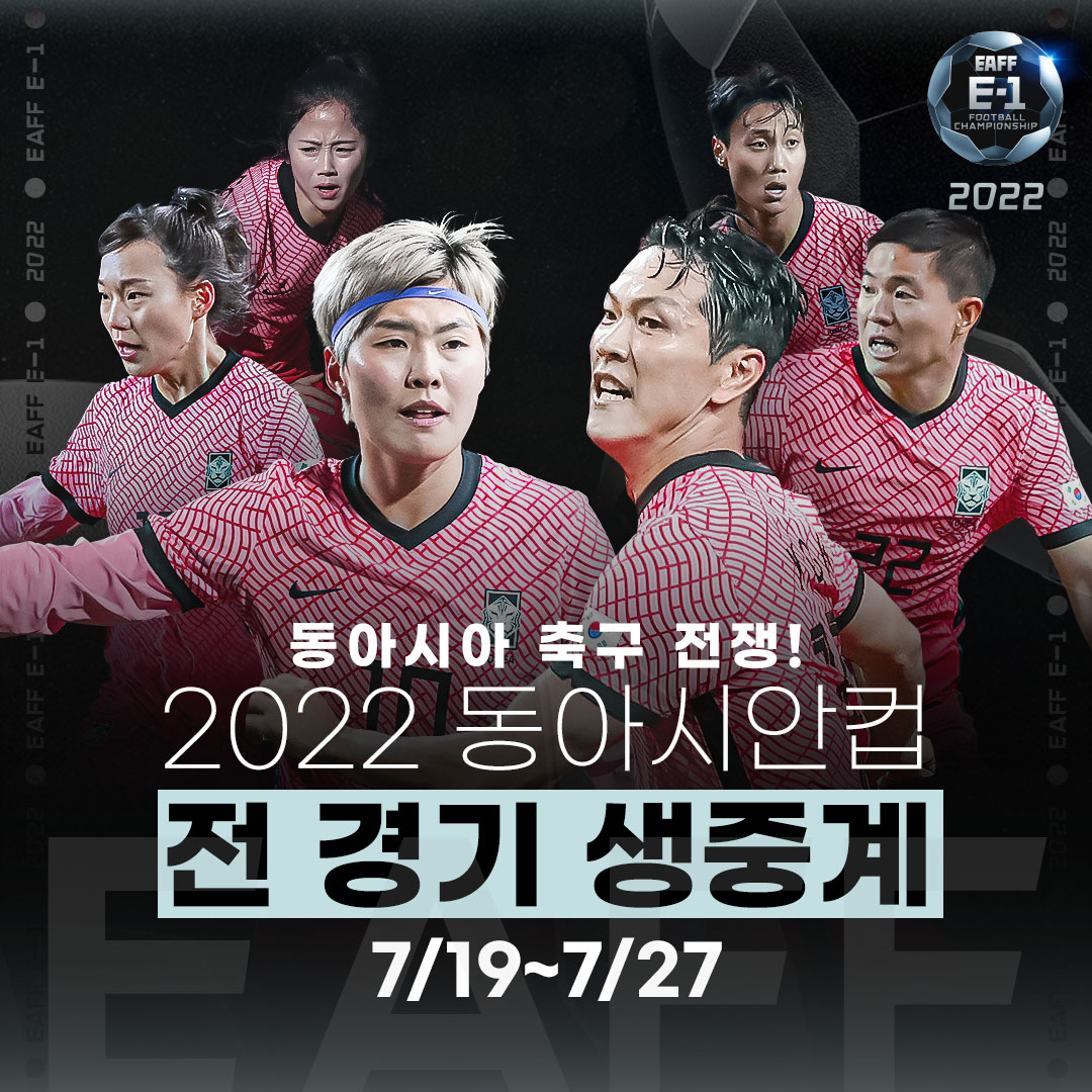 동아시아축구연맹(EAFF) E-1 챔피언십 대회가 시작합니다. 7월 19일부터 27일까지 진행되며 남자부, 여자부 경기일정 및 시청 방법에 대해 안내드리니 아래를 통해 무료 시청 바랍니다.