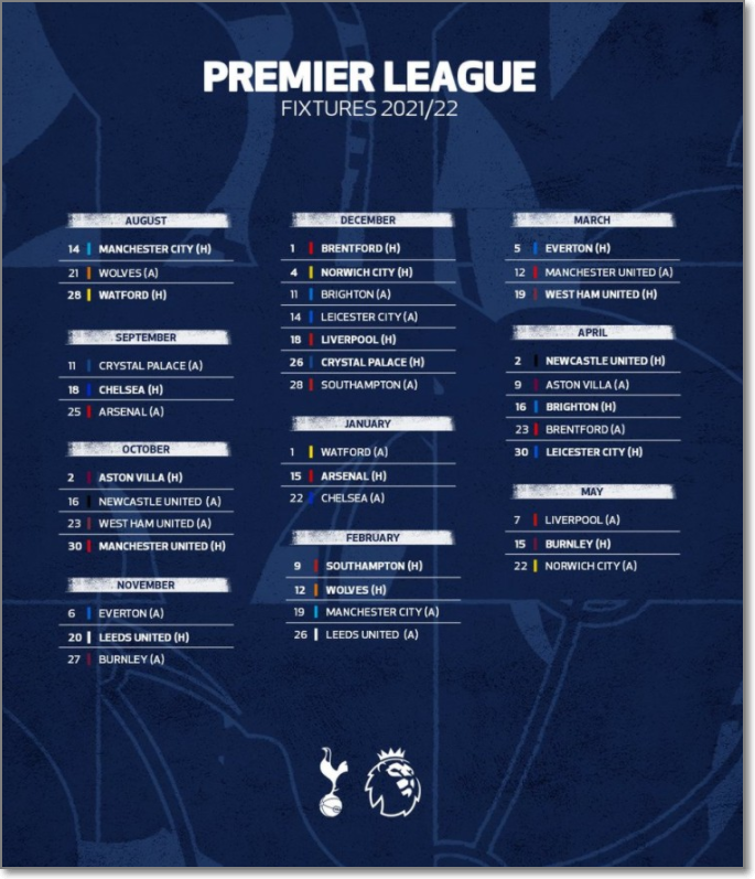 2021/22 토트넘의 경기일정은 아래와 같으며 현지시간 기준이기에 약간의 오차는 있을 수 있습니다.