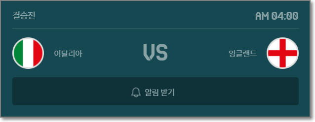 이제는 두 팀이 결승전에서 우승컵을 놓고 다투게 되었는데요. 저는 솔직히 더욱 친근한 선수들이 즐비한 잉글랜드를 응원합니다. 이탈리아는 별로 마음에 들지 않아서요. 여러분은 누구를 응원하나요?