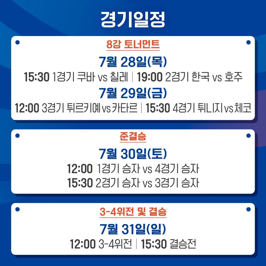 7월 28일부터 31일까지 잠실 학생체육관에서 펼쳐지는 2022 발리볼챌린저컵 중계 시청 안내드리겠습니다. 대한민국 남자배구 대표팀이 호주를 꺾고 4강에 진출했는데요. 튀르키예와 맞붙습니다. 자세한 시청 방법 아래를 참고 바랍니다.