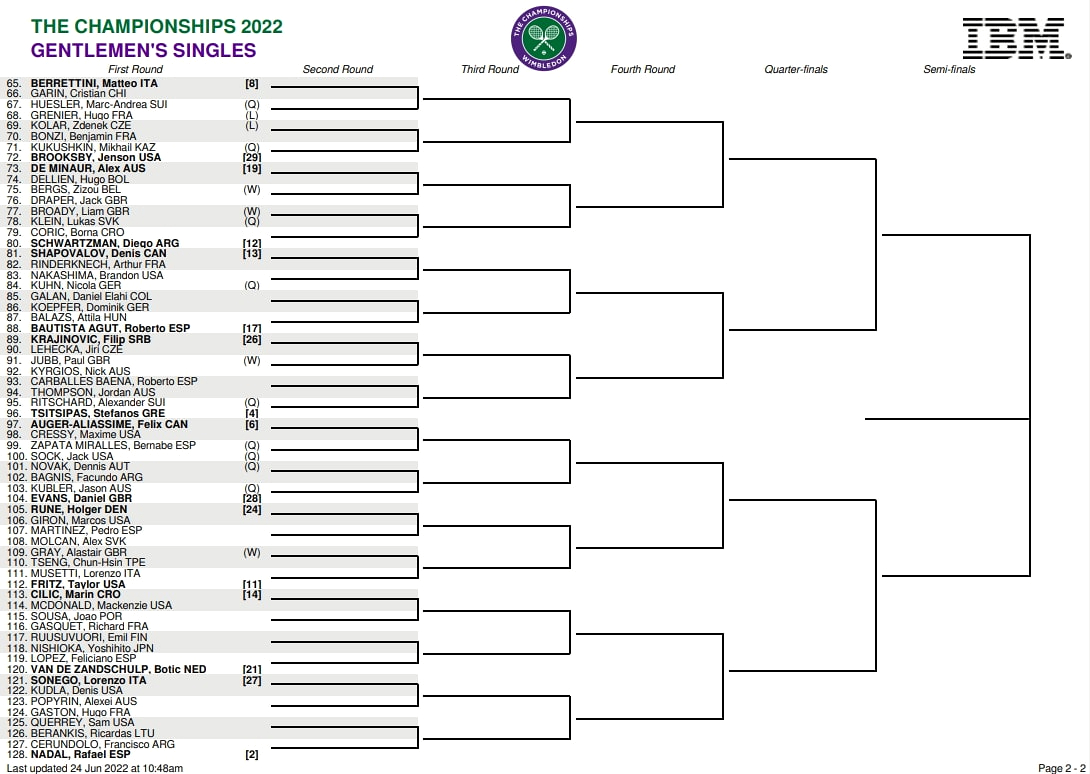 아래는 이번 윔블던 테니스 대회 대진표입니다.