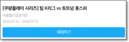 이번 토트넘과 K리그 선발팀의 경기는 쿠팡플레이에서 중계합니다. 그렇기에 예매 역시 쿠팡 사이트를 통해 진행될 것으로 예상됩니다. 아래의 사이트에서 이번 토트넘 내한경기 입장권을 예매 바랍니다.