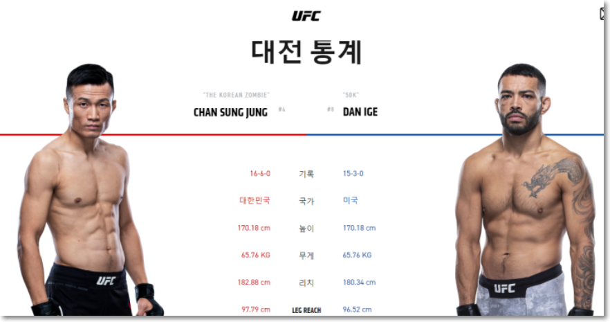 UFC Fight Night ‘정찬성 vs 댄 이게' 메인카드 대진 (경기순)
