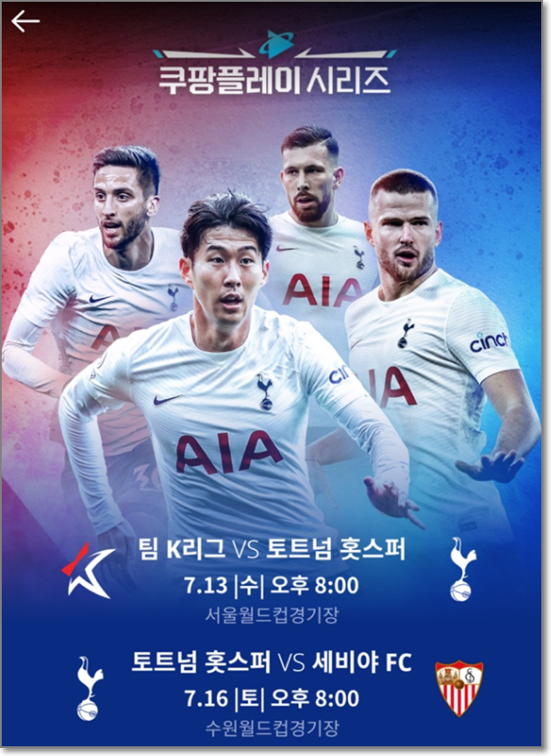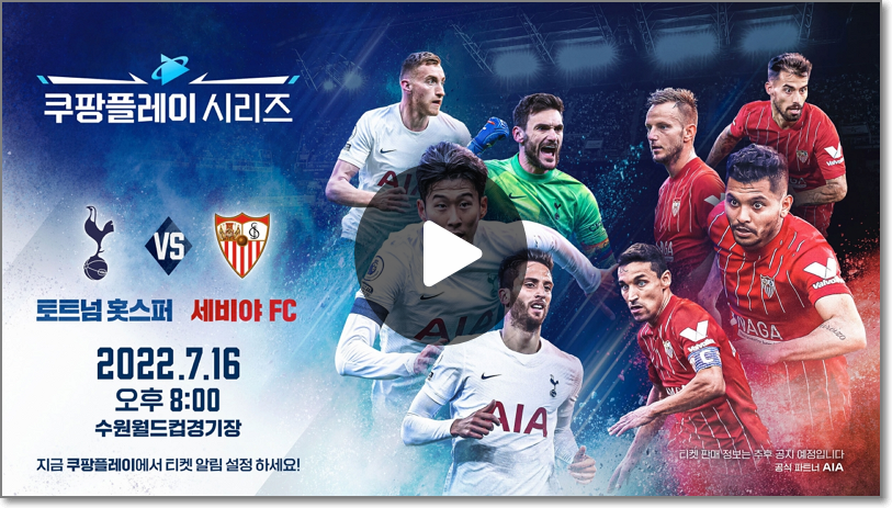이번 토트넘과 K리그 선발팀, 세비야 fc의 경기는 쿠팡플레이에서 중계합니다. 그렇기에 예매 역시 쿠팡 사이트를 통해 진행될 것으로 예상됩니다. 아래의 사이트에서 이번 토트넘 내한경기 입장권을 예매 바랍니다.