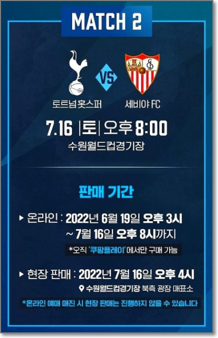 토트넘 세비야 FC 2022년 7월 토트넘 홋스퍼 FC가 프리시즌 경기를 한국에서 치릅니다. 세비야 FC와 토트넘의 경기가 있는데요. 7월 16일 펼쳐질 이번 토트넘 내한 티켓 예매방법을 안내드리니 아래