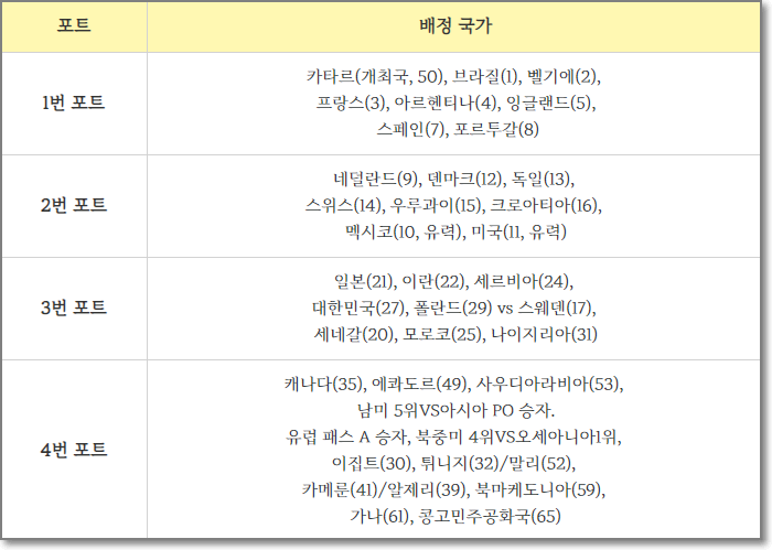 피파랭킹에 따라 29개 국가의 포트가 먼저 배정되고 진출 여부가 결정되지 않은 3팀은 4번 포트에 자리를 배정받게 됩니다. 결정되지 않은 3팀은 대륙간 플레이오프 2팀, 유럽플레이오프 A 승리팀입니다.