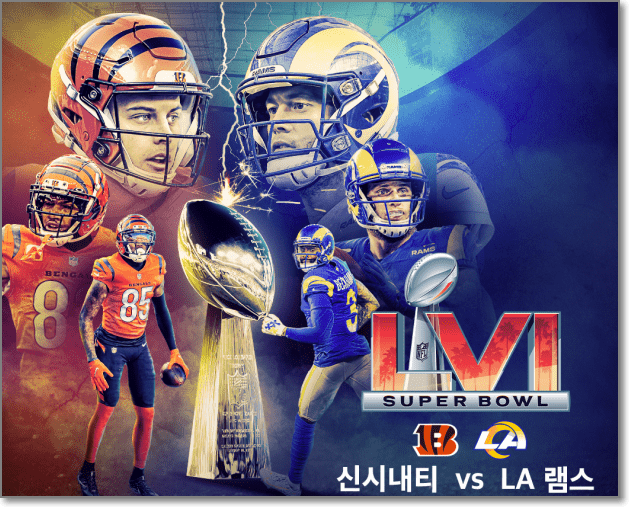 이번 2022 슈퍼볼 에서는 NFC 우승팀 로스엔젤레스 램스 의 홈구장에서 진행되며 AFC 우승팀은 신시내티 벵골스 와 격돌하게 되었습니다. 선발라인업이 발표된 이후 1쿼터 부터 2쿼터, 3쿼터, 4쿼터 등으로 진행되는 이번 슈퍼볼 에서 만약 LA 램스 가 우승하게 된다면 작년 탬파베이 에 이어서 홈에서 우승하는 두번째 팀이 되는 것이고, 1999년 이후 22년만에 우승에 도전하게 되는 것인데요. 과연, 이번 2022 슈퍼볼 은 어떤팀이 영광을 차지하게 될지 기대됩니다.