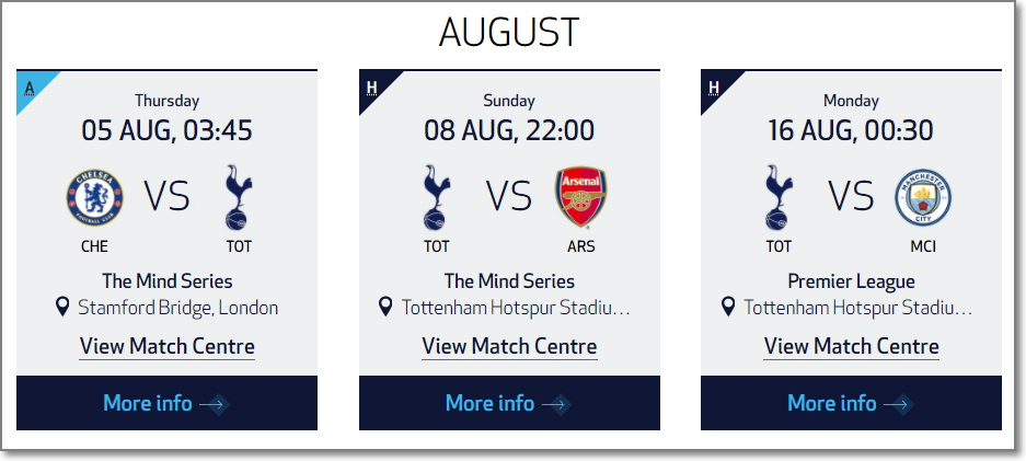 토트넘 프리시즌 5경기 중 앞 3경기의 관심도는 떨어지지만 8월 초에 일정이 잡힌 첼시, 아스널과의 경기는 비중이 큰 경기이기에 토트넘의 주축 선수들이 대거 참가하지 않을까 싶습니다.