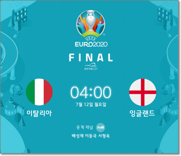 이제는 두 팀이 결승전에서 우승컵을 놓고 다투게 되었는데요. 저는 솔직히 더욱 친근한 선수들이 즐비한 잉글랜드를 응원합니다. 이탈리아는 별로 마음에 들지 않아서요. 여러분은 누구를 응원하나요?
