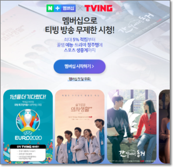 네이버 멤버십 한달 무료를 통해 TVING 무료 뿐 아니라 네이버페이 5천원을 받을 수 있습니다. 아래 링크를 통해 가입 바랍니다.