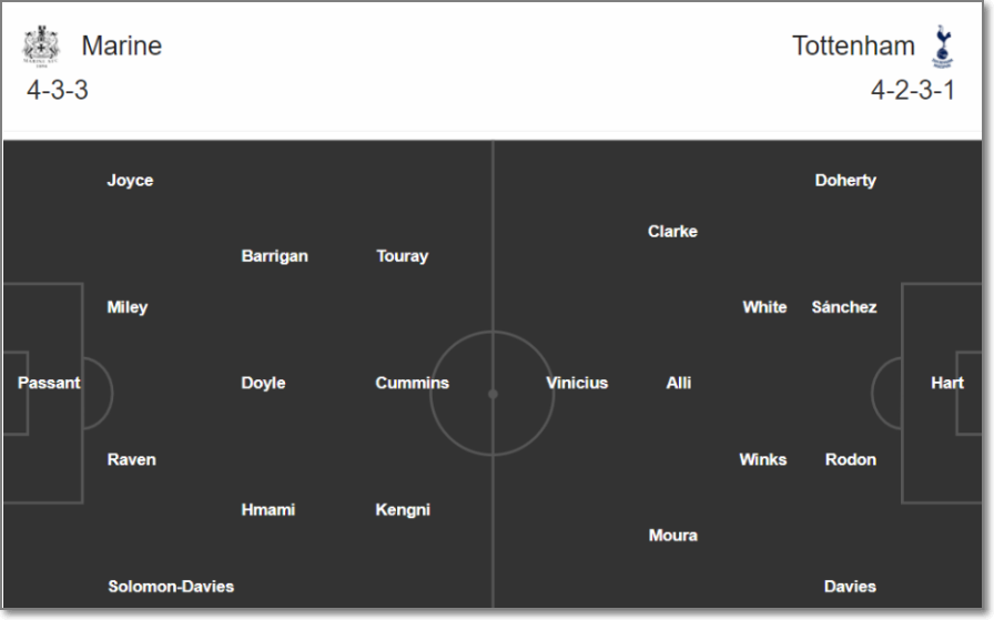 마린은 FA컵 64강 팀에 남은 팀 가운데 가장 하부리그 소속입니다. 14일에 아스톤 빌라와의 주중 리그 경기를 앞두고 있는 토트넘으로서는 11일의 하부리그 팀을 상대로 주전 선수들은 휴식을 취하게 할 것 같습니다.